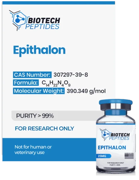 Epithalon, or Epitalon, is a small synthetic peptide that appears to activate the telomerase enzyme and may promote the release of melatonin. Experimental research has suggested its potential to slow alterations in reproductive and immune systems and improve life spans in mice and rats.[1] Apart from its potential in regulating cell aging, the peptide has also played an important role in research conducted on certain classes of cancer, infectious diseases, and DNA regulation.