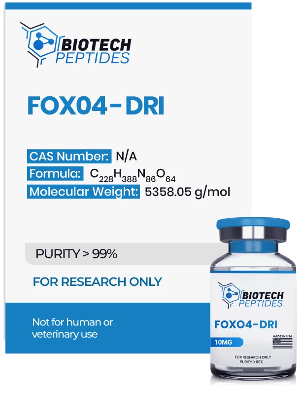 FOXO4-D-Retro-Inverso is a synthetic and partially altered form of the original FOXO4 protein. The modification was developed to help enhance the half-life of the protein and allow it to obstruct the normal FOXO4 function. FOXO4-DRI has been suggested to prevent normal FOXO4 binding to p53, eliminate senescent cells, enhance organ function, and reduce cell death progression. FOXO4-DRI also appears to influence insulin signaling, cell cycle regulation, and oxidative stress signaling pathways. The peptide appears to be permeable into cells, and researchers have suggested selectively inducing senescent cell apoptosis based on results found in studies.