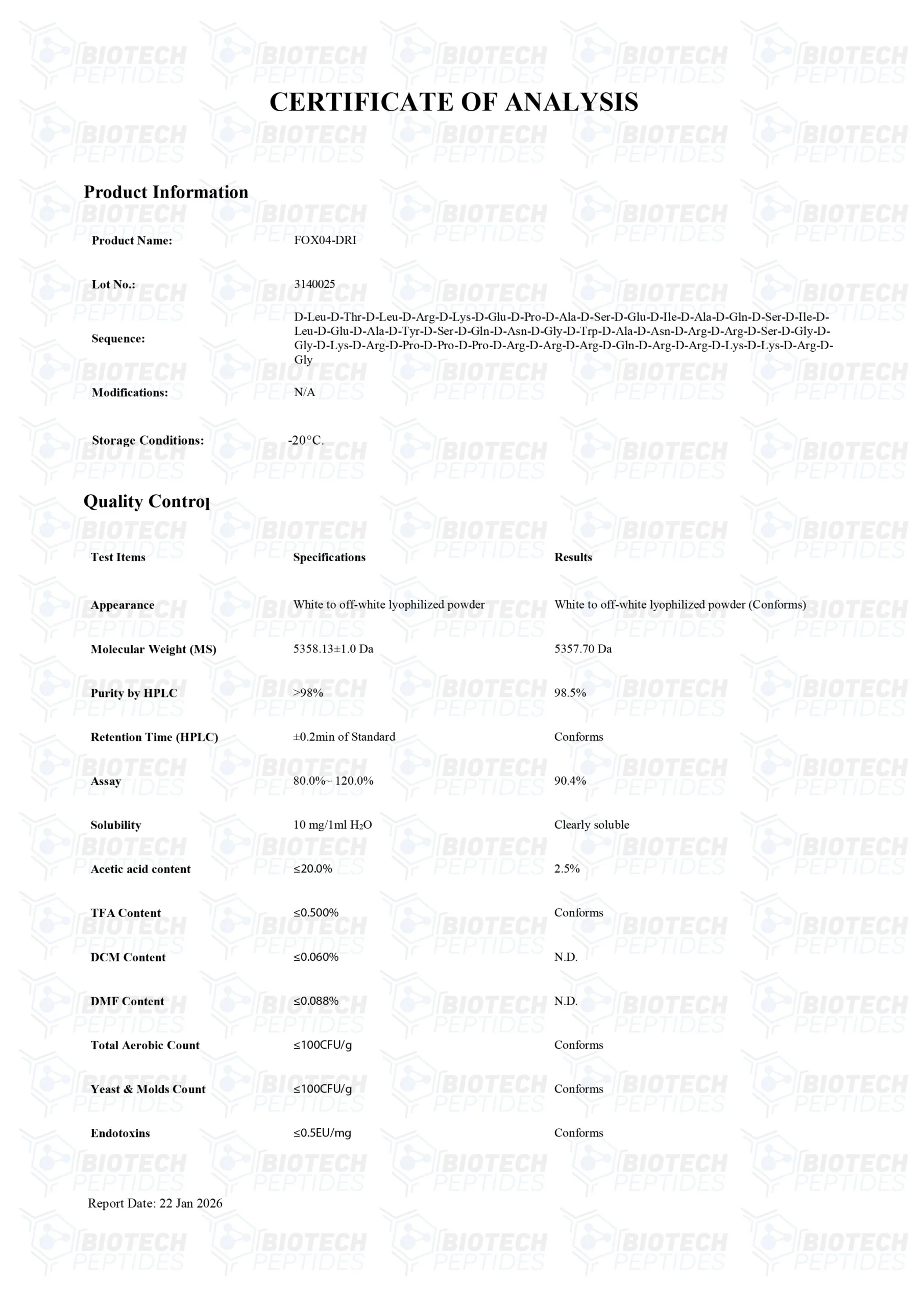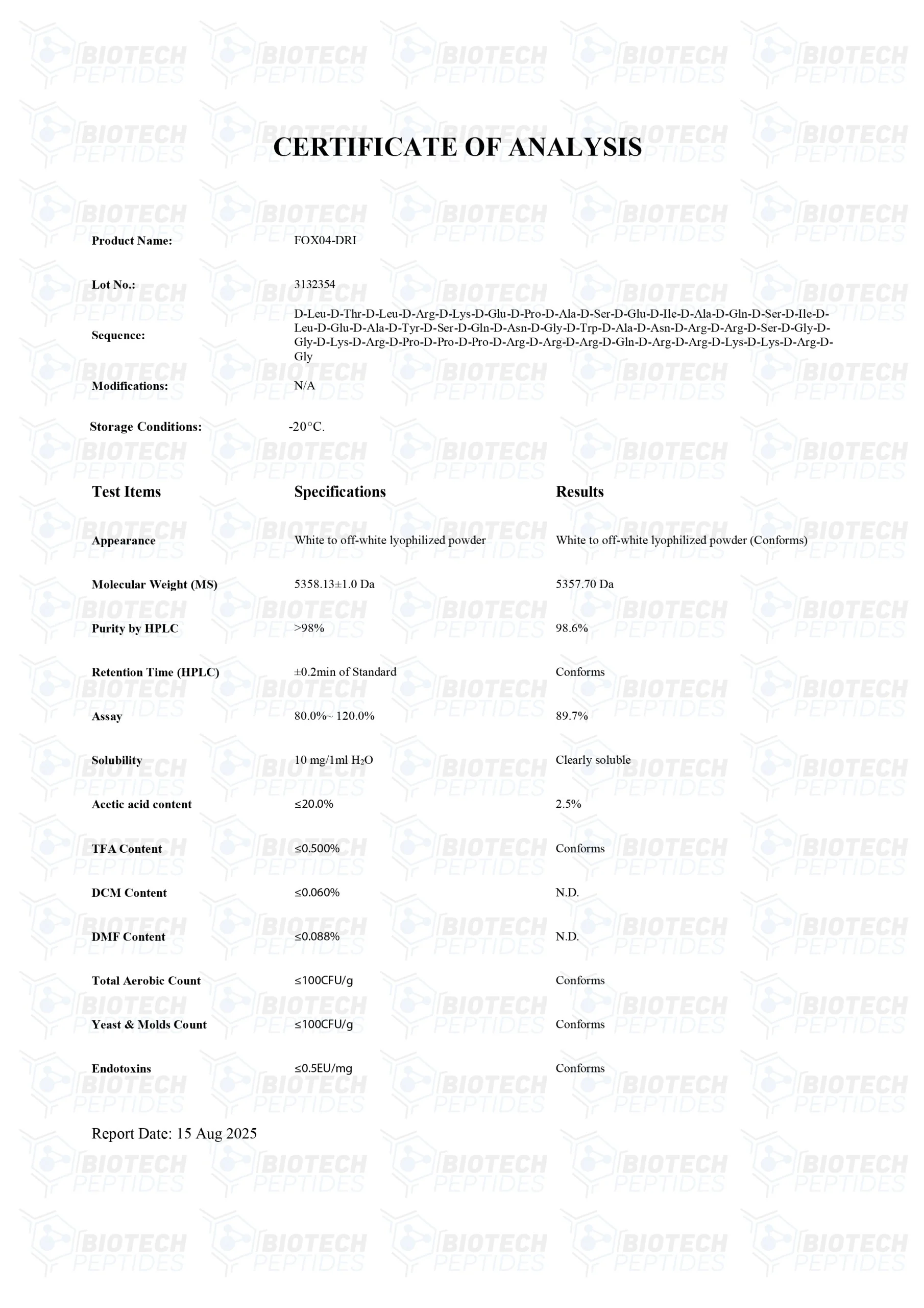FOXO4-DRI peptides are Synthesized and Lyophilized in the USA.