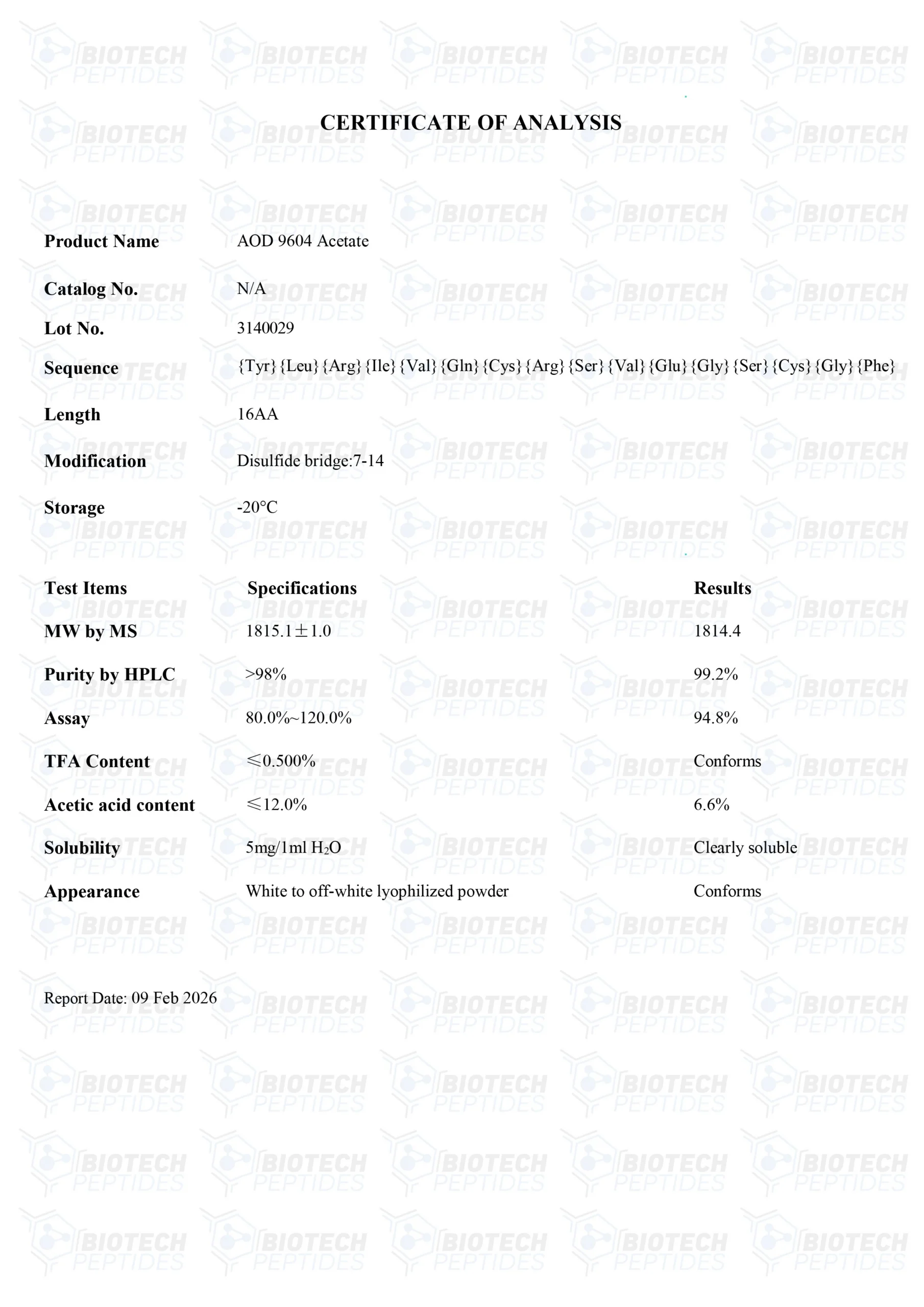 Fragment 176-191 is the shortened C-terminal fragment of hGH, encompassing a sequence of 16 amino acids. Researchers who synthesized the peptide assert that the structure corresponds to the final 16 amino acids of the hGH molecule and the peptide, therefore, is speculated to act as the "lipolytic fragment" of hGH. The designation "lipolytic" indicates that this fragment may have characteristics that facilitate the degradation of lipids or fats. In an aim to improve the stability of this peptide, the first amino acid in the sequence of hGH Fragment 176-191 has been replaced with tyrosine. As a result, this altered peptide is sometimes also known as Fragment tyr-hGH 177-191 or AOD 9604. Incorporating tyrosine at the N-terminus is thought to bolster the peptide's stability. Additionally, preliminary data suggests a naturally occurring disulfide bond between two cysteine amino acids in the original hGH and in Frag 176-191. This disulfide bond is presumed to play a role in maintaining the structural integrity of the molecule, thereby possibly enhancing its resilience and capacity to resist degradation under various environmental conditions, such as exposure to gastric acids and digestive enzymes.[2]