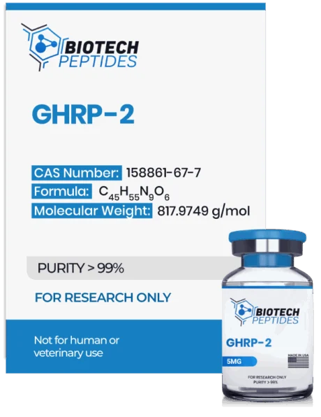 GHRP-2, also known as Pralmorelin (also available in 10mg) is a synthetic growth hormone secretagogue that researchers consider may interact with the ghrelin/growth hormone secretagogue receptor found on pituitary cells. It is a pentapeptide consisting of five amino acids and bears a resemblance to the endogenous neurotransmitter, met-enkephalin. It is proposed, albeit with uncertainty, that GHRP-2 may not function as a typical neurotransmitter. Rather, it is hypothesized to engage with ghrelin receptors. Ghrelin, identified as a hormone that regulates appetite, may be affected by interactions with GHRP-2. There is a conjecture that GHRP-2 might induce the secretion of growth hormone (GH) through potential interactions with ghrelin receptors on the pituitary gland, specifically the growth hormone secretagogue receptors (GHS-Rs). Yet, the nature of this interaction is still under investigation and not conclusively established. Extensive research has also been performed to evaluate its role in regulating various physiological processes, including muscle development, appetite, immune functions, and sleep cycles.[1]