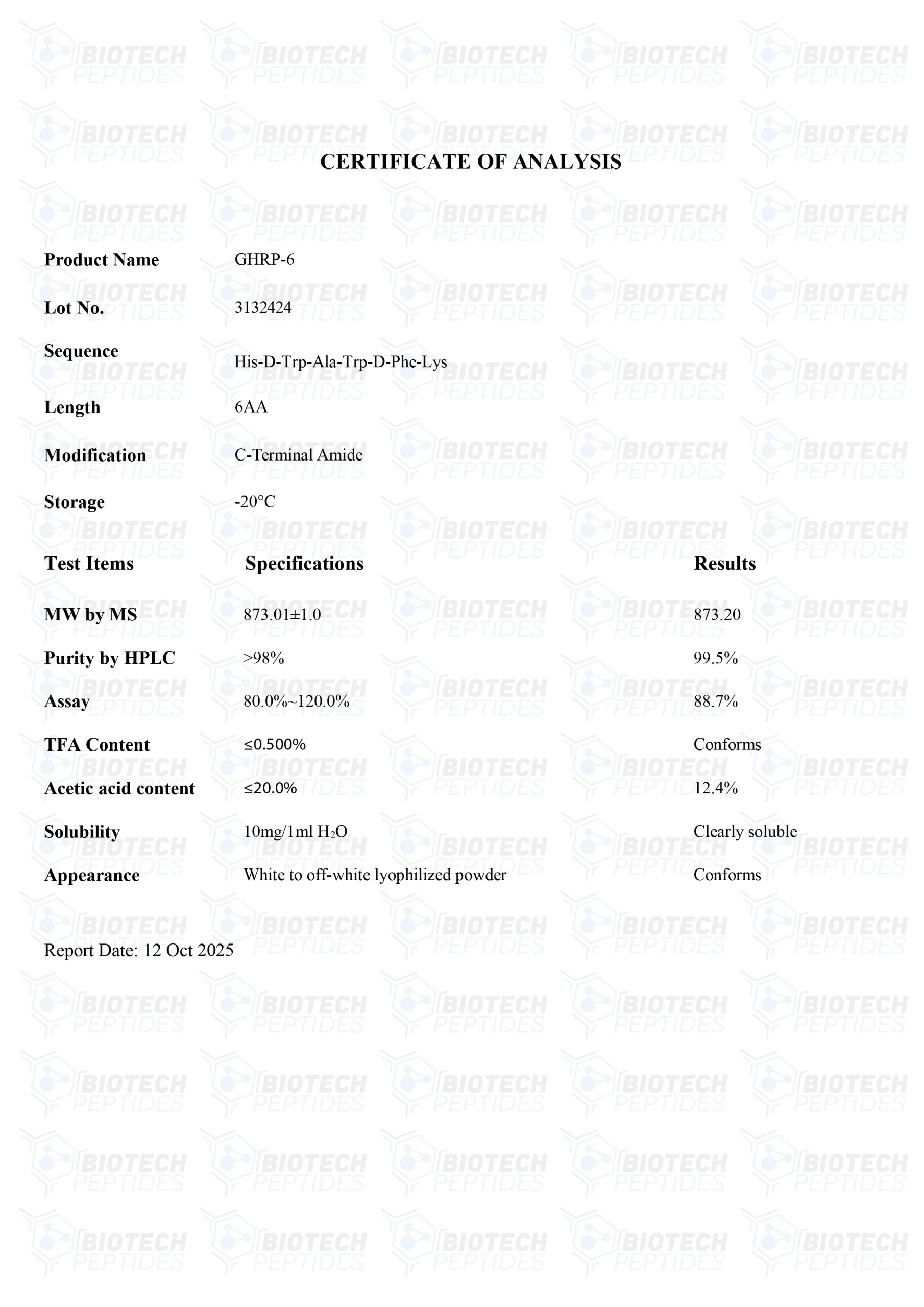 GHRP-6 peptides are Synthesized and Lyophilized in the USA.
