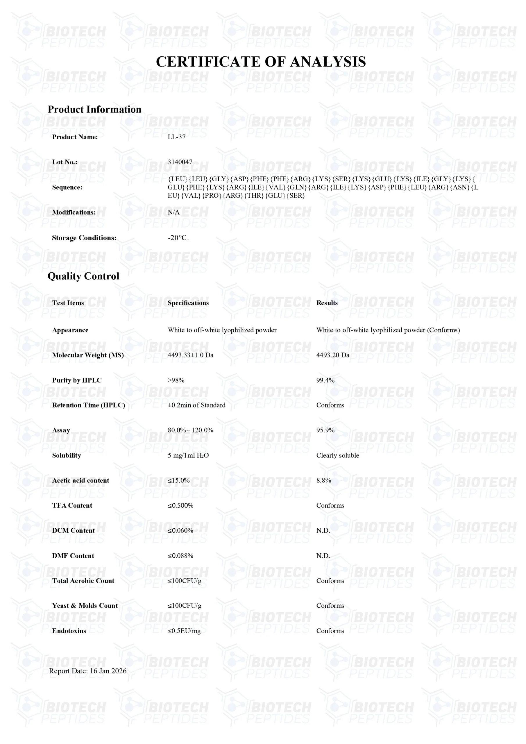 LL-37 peptides are Synthesized and Lyophilized in the USA.