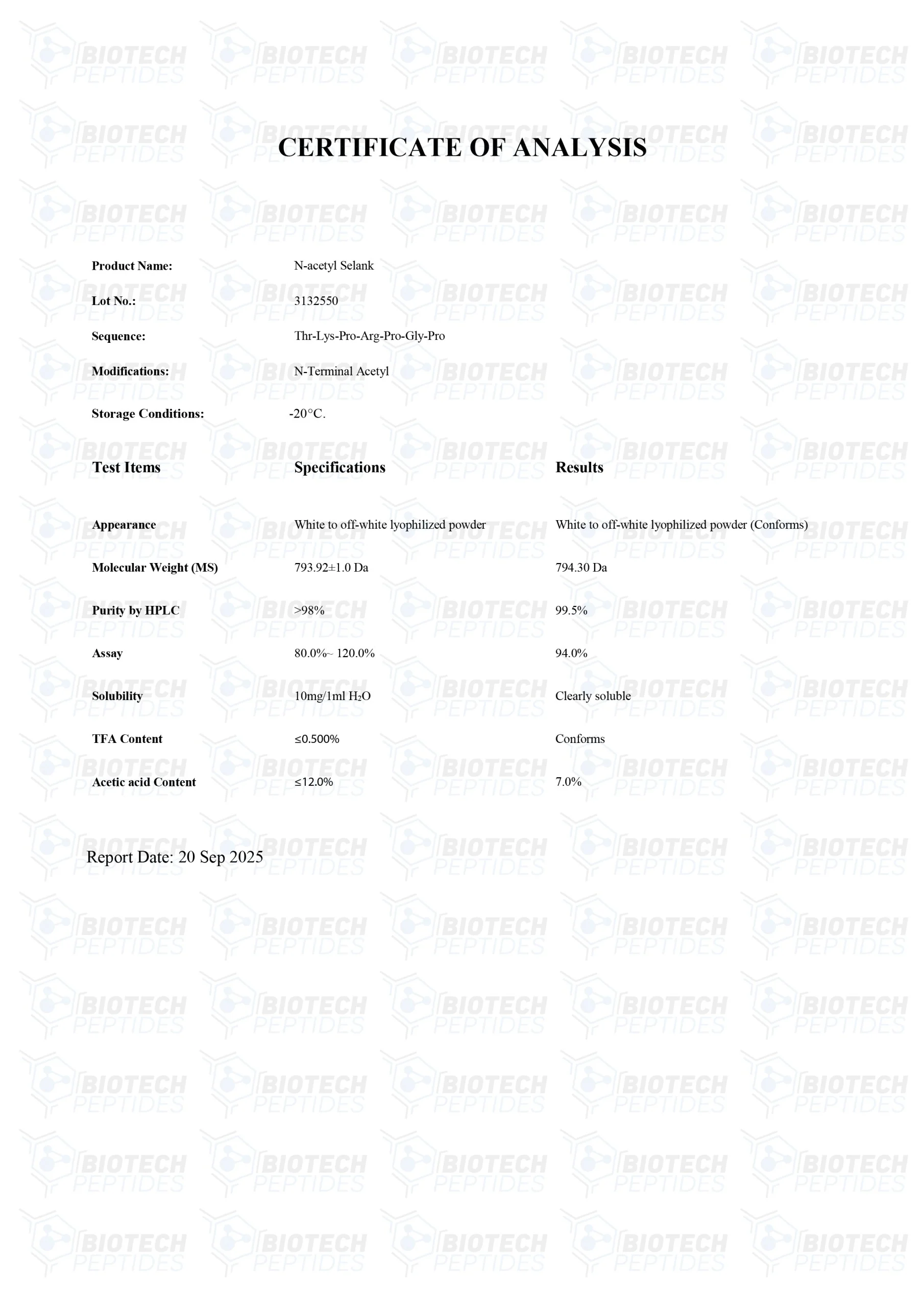 N-Acetyl Selank peptides are Synthesized and Lyophilized in the USA.