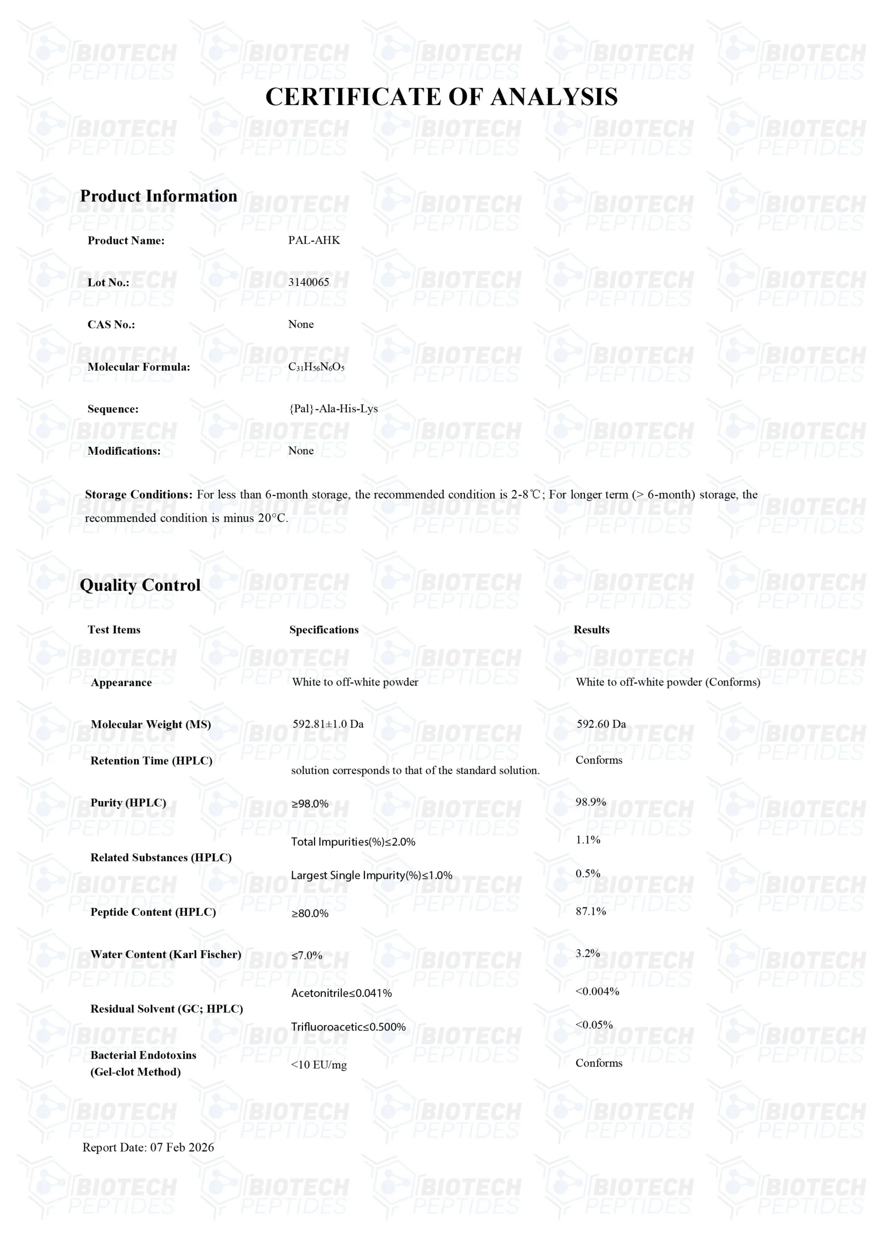 PAL-AHK (Palmitoyl Tripeptide-3) peptides are Synthesized and Lyophilized in the USA.