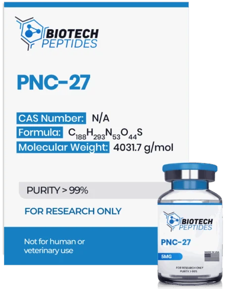 PNC-27 is a synthetic peptide initially developed for its proposed inhibitive action on cancer cell proliferation. It is a member of the PNC family of probe proteins and is designed to attach to malformed cancer cells and induce cell necrosis, but bypass normal functioning cells. The PNC-27 peptide contains the HDM2 binding domain and transmembrane domain corresponding to residue 1226 on p53. Researchers suggest that it exhibits potential to bind to and kill cancer cells through membrane lysis or cell membrane destruction. Research studies have suggested that the PNC-27 peptide may be selective in targeting specific cancer cell types, prompting further research within the context of pancreatic cancer, breast cancer, leukemia, melanoma, and other cancer strains.[1]