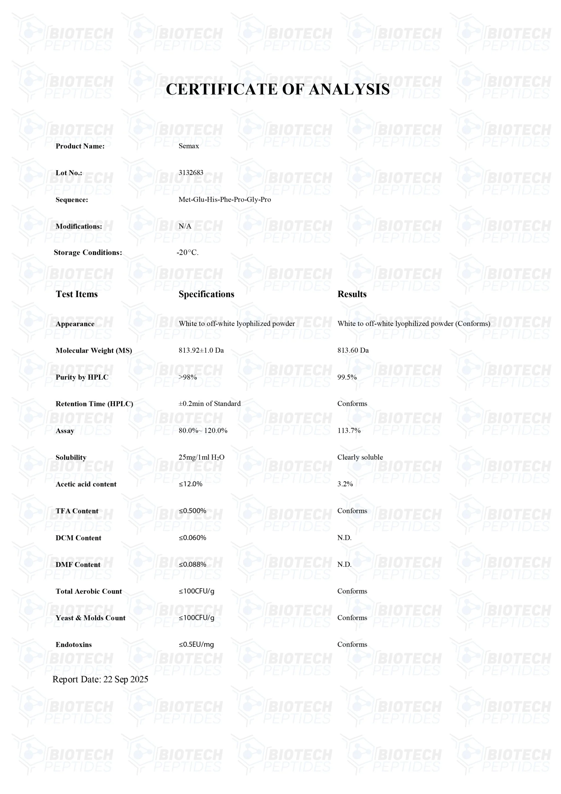 Semax peptides are Synthesized and Lyophilized in the USA.