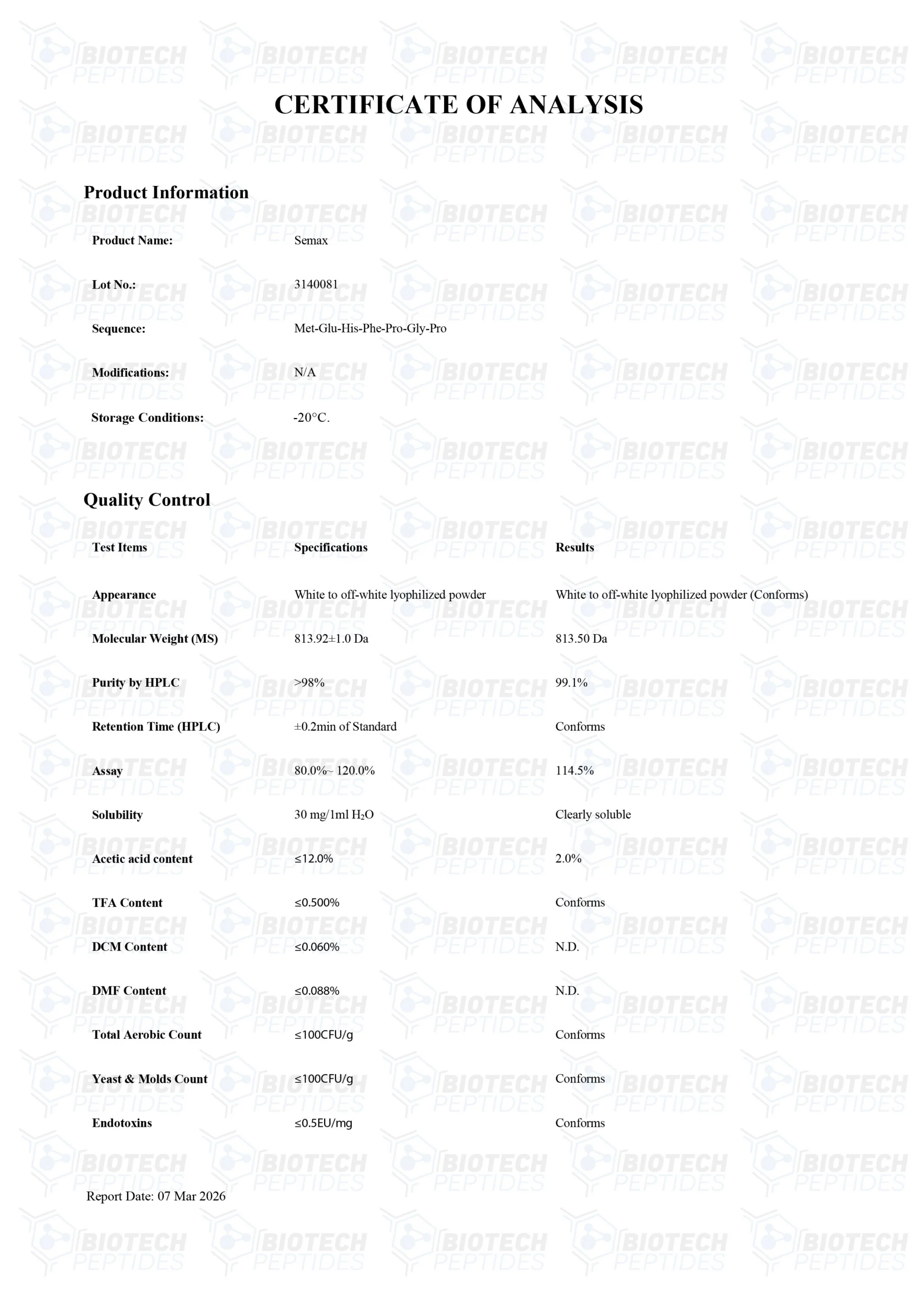 Semax is a synthetic heptapeptide consisting of the amino acid sequence Met-Glu-His-Phe, a partial sequence derived from the naturally occurring adrenocorticotropic hormone (ACTH). This primary sequence is further augmented by appending a Pro-Gly-Pro (PGP) tripeptide at the C-terminal end, a modification hypothesized to potentially increase the molecule's lipophilicity. Enhanced lipophilicity might, in turn, improve the peptide’s capacity for passive diffusion or uptake through the brain's protective blood-brain barrier (BBB). Such facilitation might occur via lipid raft-mediated endocytosis mechanisms, potentially allowing the peptide to bypass the tight junctions that normally impede substances from entering the brain. Additionally, incorporating the PGP sequence at the C-terminus of the peptide is posited to influence its interaction with specific transporters or receptors located on the BBB, which might promote its entry into the brain through receptor-mediated transcytosis. Furthermore, acetylating Semax may confer increased molecular stability, potentially rendering the peptide more resistant to enzymatic degradation. This alteration might result in an extended half-life of Semax within biological systems, allowing for a prolonged period of activity before breakdown occurs.