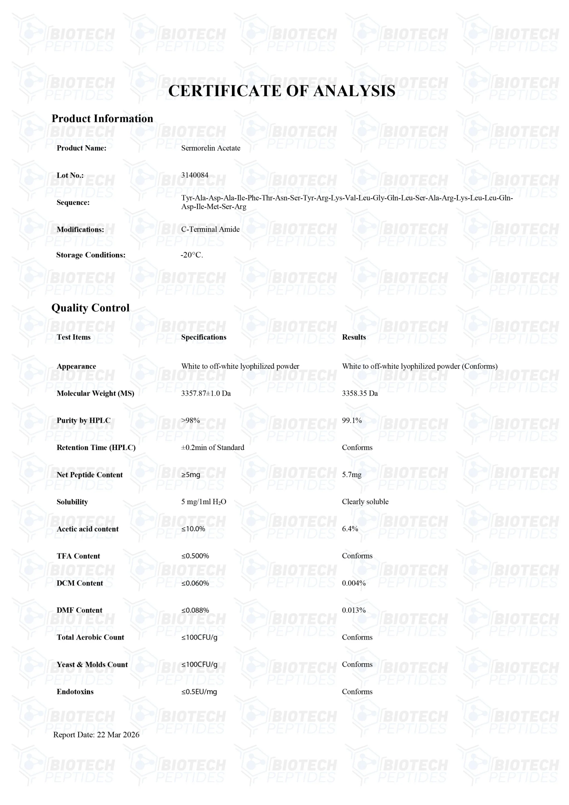 Sermorelin peptides are Synthesized and Lyophilized in the USA.
