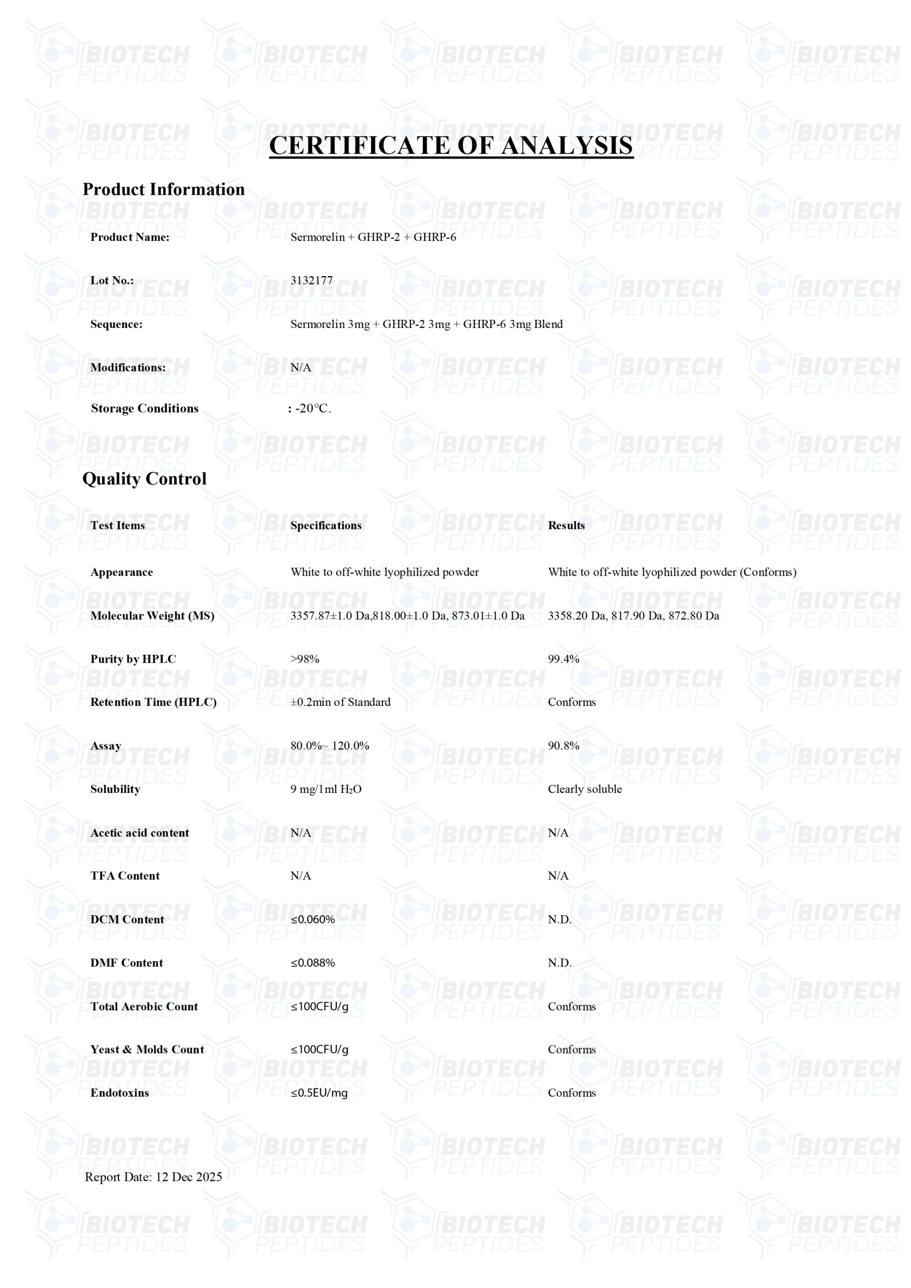 Sermorelin & GHRP-6 & GHRP-2 peptide blend is Synthesized and Lyophilized in the USA.