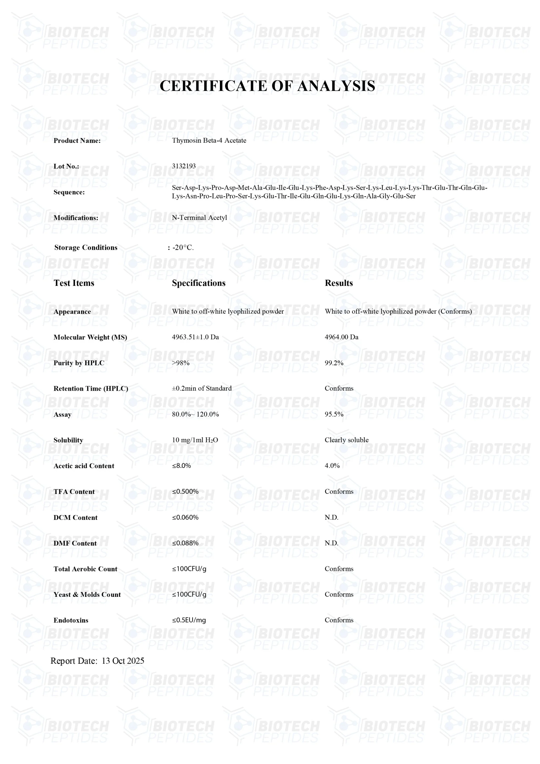 TB-500, or synthetic Thymosin Beta-4, also known as synthetic Tβ4, is a synthetic analog of the endogenous Thymosin Beta-4 protein, which is considered to be ubiquitously present in cells. The peptide belongs to a widespread family of 16 related molecules observed to exhibit a high degree of sequence conservation and localization in most tissues and circulating cells. TB-500 was developed to sequester and block actin polymerization in eukaryotic cells.